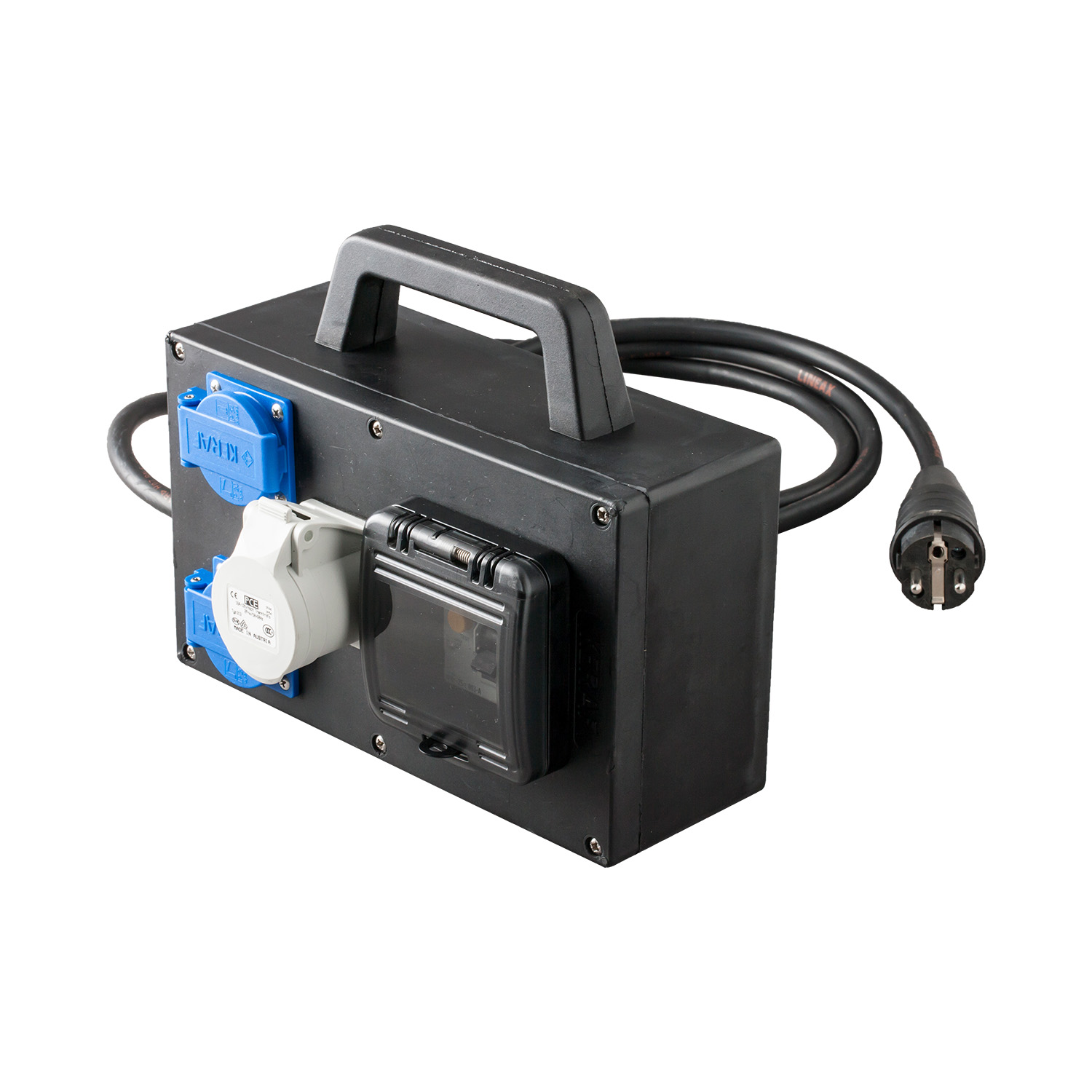 Merk: Keraf Type: ALSbox KED21-1H Materiaal Behuizing: Volrubber Beschermingsgraad (IP): IP44 Ingangsaansluiting: 2,5 meter H07RN-F aansluitkabel Uitgangen/Contactdozen: PCE CEE 12h/1h/6h en SchuKo wandcontactdozen Beveiliging: volrubber dubbel geïsoleerde behuizing, voorzien van 30 mA aardlekschakelaar |