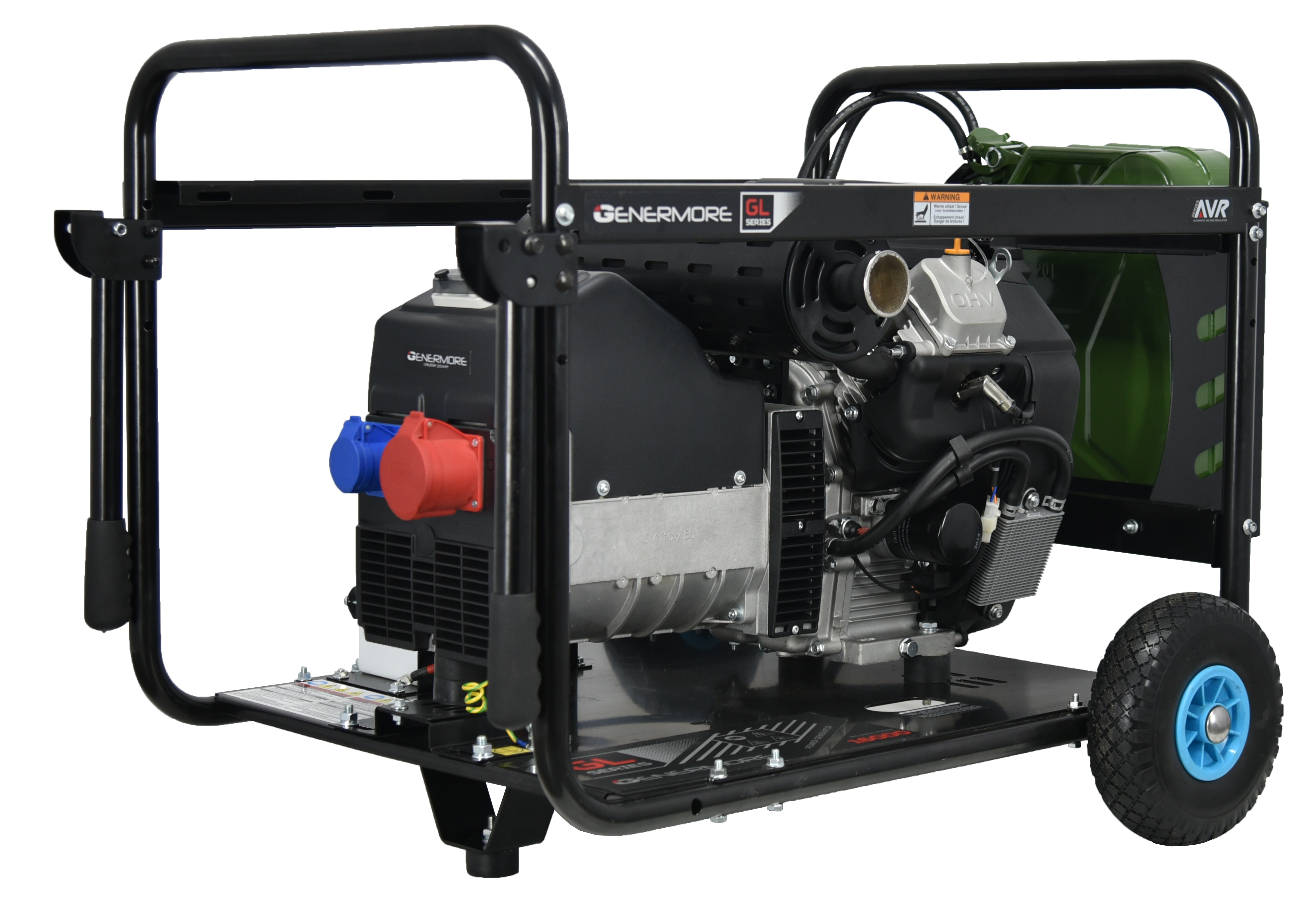 Genermore Benzine Generator GL-serie 15kVA met AVR Driefasig (3x400V) · Krachtige LC2V80FDV V-TWIN motor, goed voor 24pk en 51Nm · Elektrische sleutelstart · Jerrycan van 20L · Wielenset inbegrepen · Thermische- en oliebeveiliging · 1 x 16A Schuko stekker en · 1 x 32A CEE stekker 3P+N+PE |