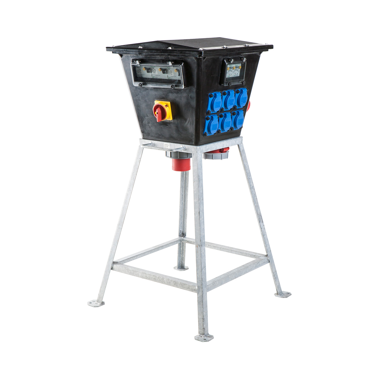 Merk: Keraf Type: Verdeelkast KE100 Materiaal Behuizing: Volrubber Beschermingsgraad (IP): IP44 Ingangsaansluiting: CEE 63A 5p 400V Uitgangen/Contactdozen: 6 contactdozen met randaarde (SCHUKO), 1 CEE-contactdozen 63 A/400 V/5P , 1 CEE-contactdozen 32 A/400 V/5P, 2 CEE-contactdozen 32 A/400 V/4P Beveiliging hoofdschakelaar 4p 63A 3 x automaat 32A 3p C-kar 3 x automaat 16A 1p C-kar 1 x aardlekschakelaar 4p 40A 30mA type A 1 x aardlekschakelaar 4p 63A 30mA type A |