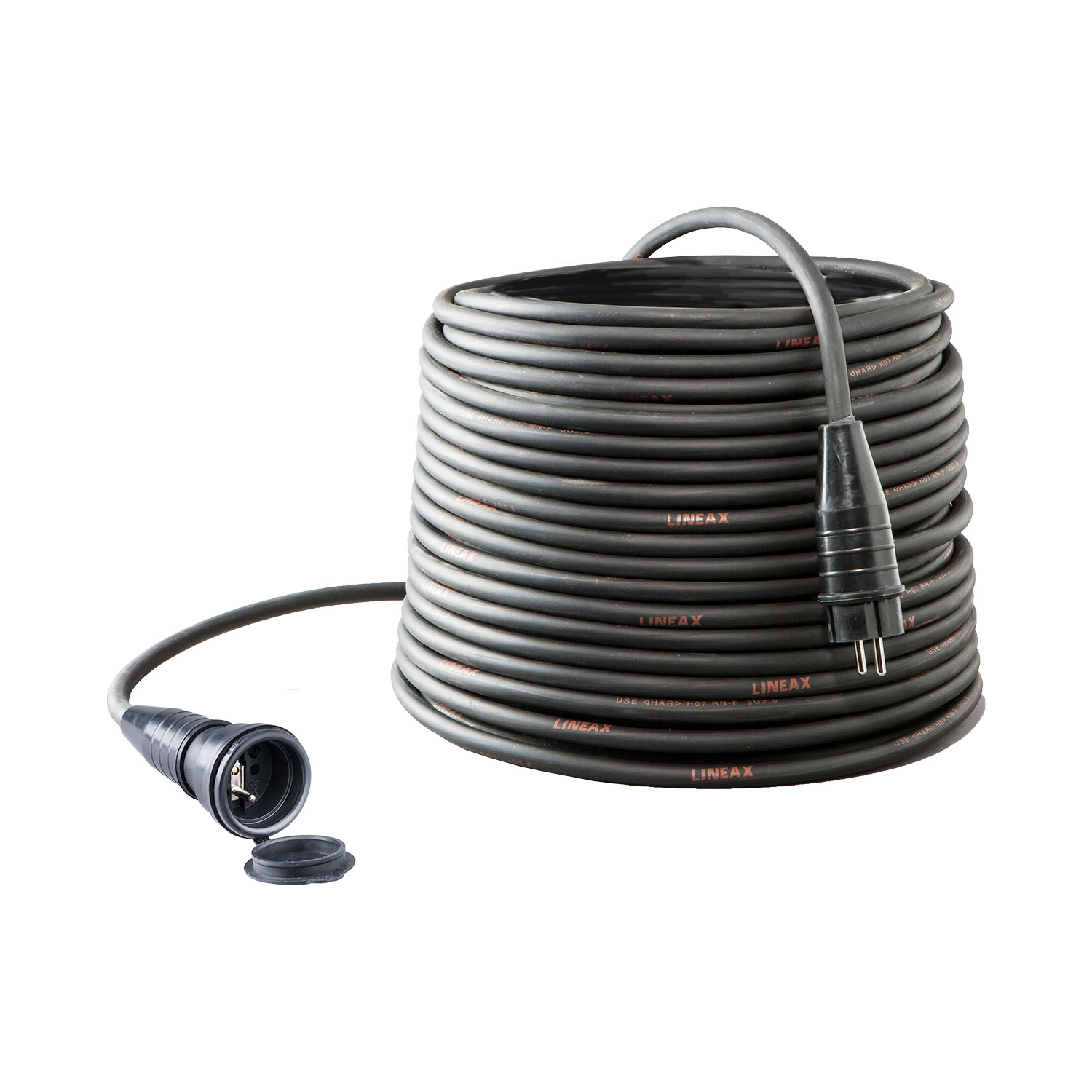 Topkwaliteit neopreen verlengkabel met gemonteerde 16A 250V volrubber KERAF contactstop met gecombineerde rand- en penaarde en koppelcontactstop met penaarde, voorzien van deksel.